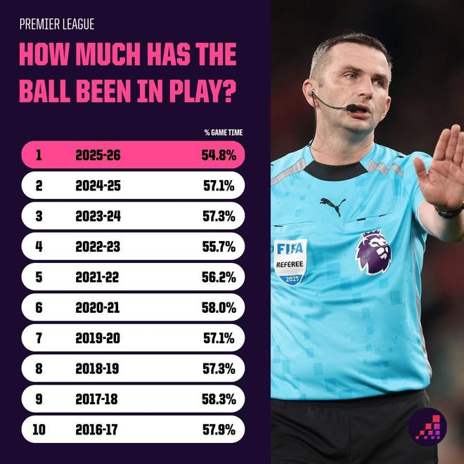 如今比赛时长确实有所增加,赛事为打击拖延时间行为,会在每场比赛末尾加入更长补时,但球迷看到的实际比赛(有效控球)时间,仍几乎低于近年任何一个赛季。